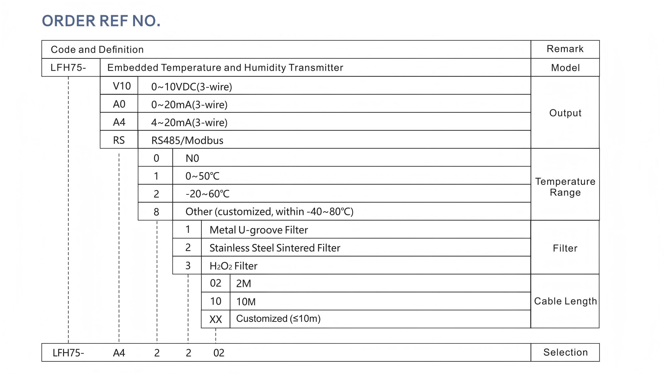 2. Example LFH75-A42202 represents an embedded temperature and humidity transmitter with current output 4-20mA, temperature range -20-60℃, stainless steel sintered filter, and 2-meter cable length.